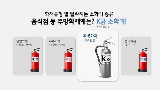 주방을 의미하는 키친(Kitchen)에서 앞 글자를 따온 K급 소화기는 식용유 등 기름에 불이 붙었을 경우 사용하면 유막을 형성해 식용유의 온도를 낮추고 산소 공급을 차단해 불을 끄므로 기름 사용이 많은 주방에 적합하다.