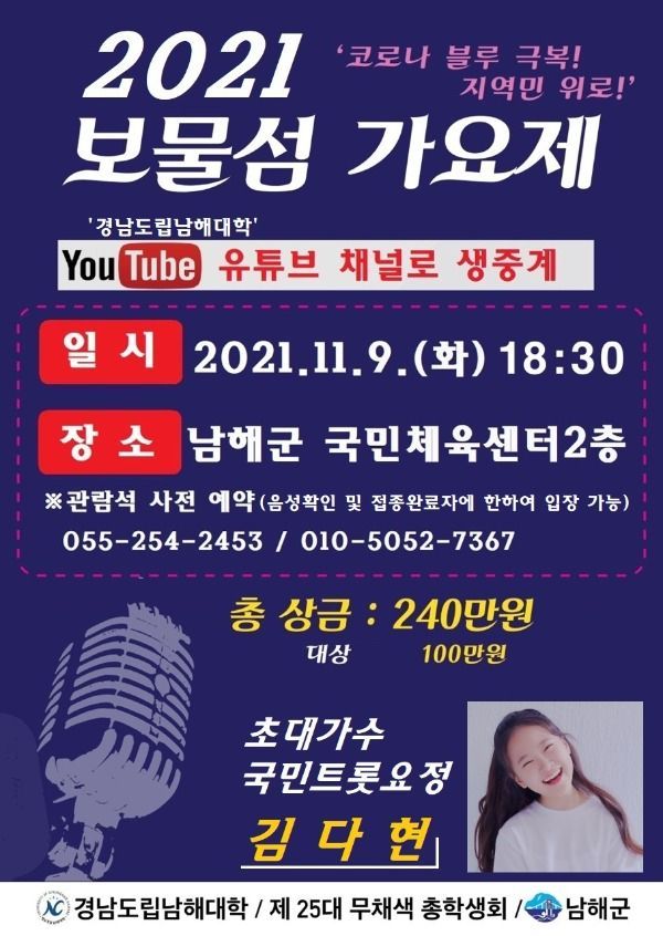 [경남도민뉴스] 경남도립남해대학(총장 조현명)이 지역민과 함께하는 축제 ‘2021 보물섬 가요제’를 개최한다.
