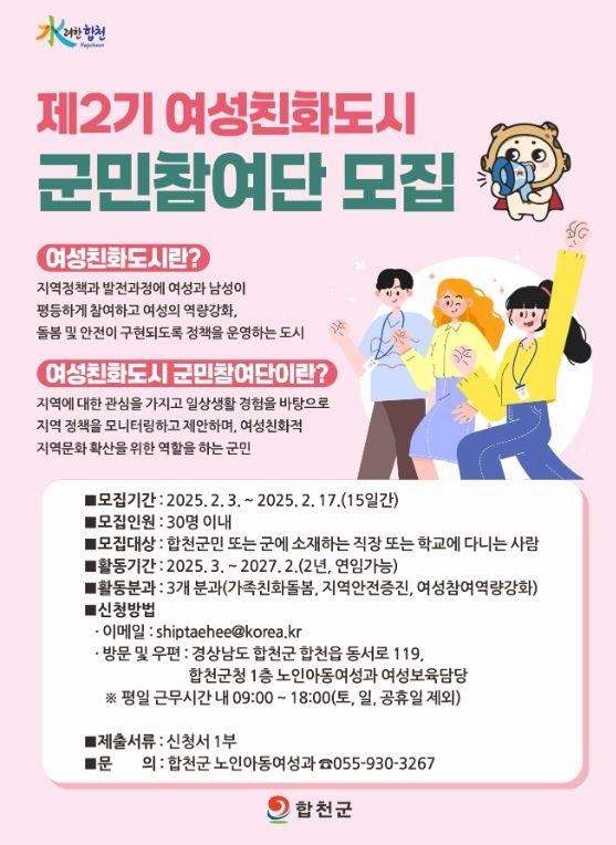 [경남도민뉴스=김춘호 기자] 합천군은 군민과 함께하는 희망찬 미래의 합천을 만들기 위해 3일부터 17일까지 ‘제2기 합천군 여성친화도시 군민참여단’을 공개모집 한다고 밝혔다.