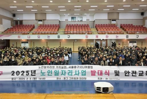 [경남도민뉴스=김완호 기자] 서울 중구는 지난 2월 3일 중구 구민회관에서 중구시니어클럽의 ‘2025년 노인 일자리 발대식’을 진행했다고 밝혔다. 행사에는 400여 명의 어르신과 관계자들이 참석했다.