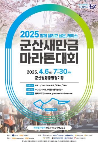 오는 4월 6일 군산시 일원에서 열리는 ‘2025 군산 새만금 마라톤대회’는 군산시와 대한육상연맹이 공동주최하고 전북 특별자치도 육상연맹과 군산시 육상연맹이 주관한다.