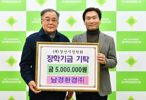 [경남도민뉴스=최민숙 기자] (재)경산시장학회는 6일 남경환경㈜이 지역 인재 육성을 위한 장학금 500만 원을 (재)경산시장학회에 기탁했다고 밝혔다.