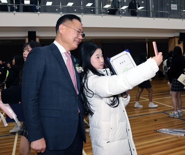 몇몇 졸업생은 김 군수에게 다가가“군수님, 사진 한 장 찍어주세요!“라고 요청했다. 김 군수도 환한 미소로 응답하며 학생들과 함께 사진을 찍었다.