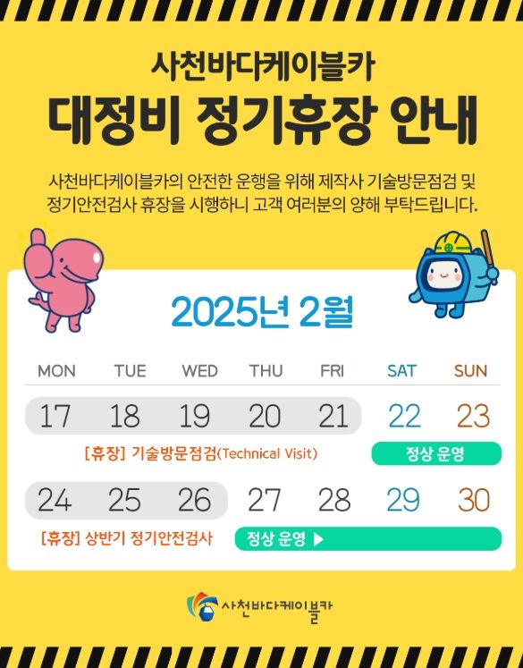 [경남도민뉴스=변정형 기자] 사천시시설관리공단은 사천바다케이블카의 시스템 성능 최적화와 상반기 정기 안전검사를 위해 오는 17일부터 2차례에 걸쳐 임시 휴장한다고 밝혔다.