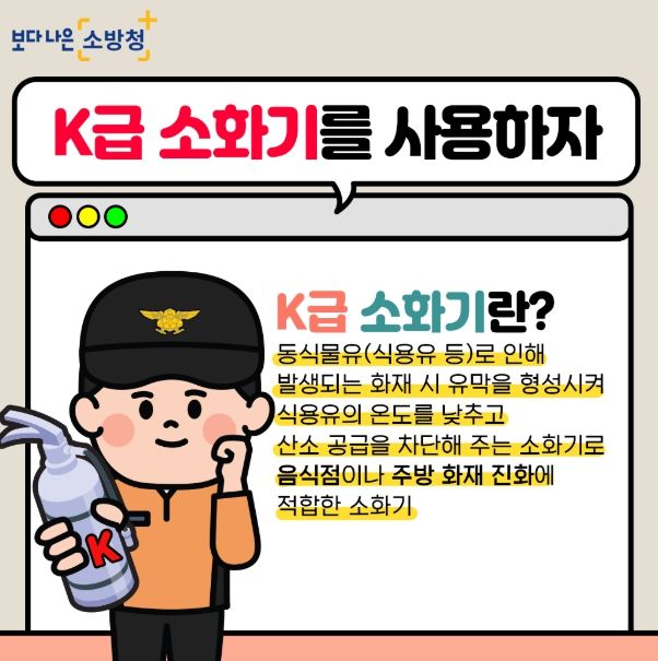 김종욱 소방서장은 “주방에서 발생하는 화재를 예방하기 위해서는 음식물 조리 시 자리를 비우지 않고 지켜보는 것이 중요하다”라며, “만약 주방 화재가 발생하더라도 주방에 K급 소화기를 비치한다면 신속한 대응이 가능하니 혹시 모를 주방화재를 위해 K급 소화기 비치를 당부드린다”라고 말했다.