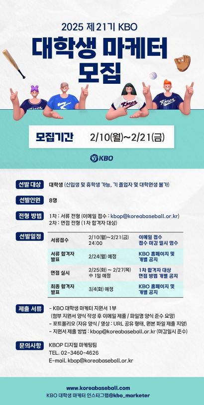 지원서와 포트폴리오는 2월 10일(월)부터 2월 21일(금) 자정까지 이메일로 제출해야 하며, 자세한 내용 및 유의사항은 KBO 홈페이지 및 인스타그램을 통해 확인 가능하다.