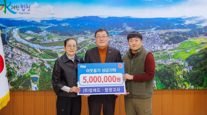 [경남도민뉴스=김춘호 기자] 합천군은 지난 17일, 합천군 합천읍에 소재한 ㈜탑애드·탑광고사 (대표 전종모)가 합천군청을 방문해 이웃돕기 성금 500만원을 기탁했다고 밝혔다.