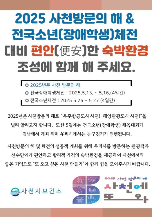[경남도민뉴스=변정형 기자] 사천시는 사천방문의 해와 전국 규모의 체육대회를 대비해 관내 숙박업소를 대상으로 위생적이고 친절한 숙박환경 조성을 위한 특별위생점검을 실시한다고 24일 밝혔다.