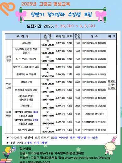 [경남도민뉴스=최민숙 기자] 고령군은 2월 25일부터 3월 5일까지 2025년 상반기 평생교육 정기강좌 수강생을 모집한다.