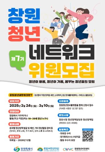 [경남도민뉴스=박민호 기자] 창원특례시는 청년들의 목소리를 시정에 반영하고, 청년 정책 개발에 적극 참여할 ‘제7기 창원 청년네트워크’ 위원을 모집할 예정이다.