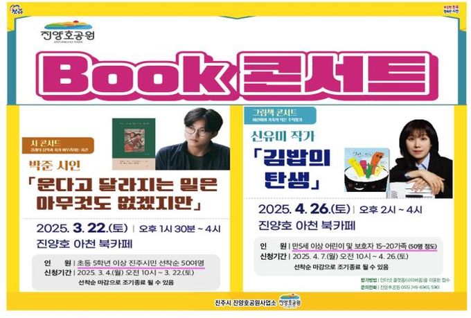 시 관계자는 “음악과 책이 어우러진 진양호공원 북 콘서트를 통해 시인과 그림책 작가를 가까이에서 만나 따듯한 이야기를 나누고 흥미진진한 체험을 함께하며 가족과 소중한 추억을 쌓는 시간이 되길 바란다”고 말했다.