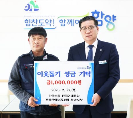 [경남도민뉴스=장광동 기자] 함양군은 27일 한국노총 전국연대통합 건설산업노동조합 경남지부에서 어려운 이웃을 위해 사용해 달라며 성금 100만 원을 전달했다고 밝혔다.