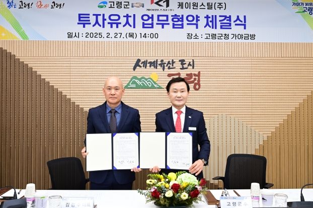 [경남도민뉴스=최민숙 기자] 고령군은 지난 2월 27일 가야금방에서 케이원스틸(주)과 투자유치 업무협약을 체결했다.
