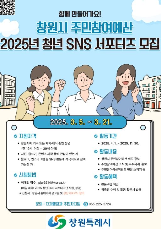 [경남도민뉴스=박민호 기자] 창원특례시는 주민참여예산제도를 널리 알리고, 청년층의 관심과 참여를 높이기 위해 ‘창원시 주민참여예산 청년 SNS 서포터즈’를 모집한다고 밝혔다.
