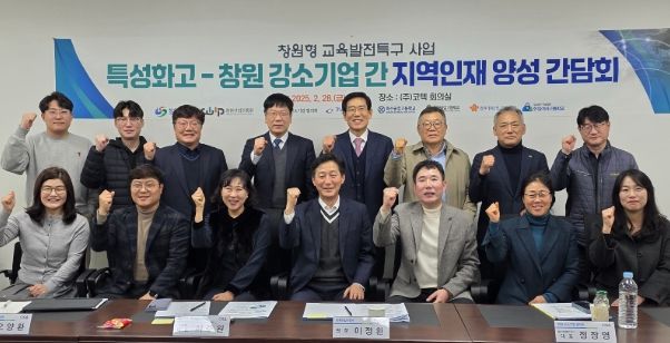 [경남도민뉴스=박민호 기자] 창원산업진흥원은 지난 2월 28일 코텍에서 ‘창원형 교육발전특구사업’의 일환으로 ‘특성화고-창원 강소기업간 지역인재 양성 간담회’를 개최했다. 이번 간담회에는 창원기계공업고·창원공업고·마산공업고·한일여고·경남관광고 등 관내 5개 특성화고 교장단과 창원시 강소기업협의회 임원단 소속 4개사(㈜코텍, 에스엠에이치㈜, ㈜에스엠에이티, (유)코아시스템) 대표 등 20여 명이 참석했다.