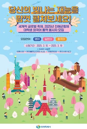 이성민 문화관광체육국장은 “진해군항제는 작년에 외국어 리플릿이 조기 소진될 만큼 글로벌 축제로 성장하고 있어 외국어 통역 봉사자의 역할이 매우 중요하다”며 “활동 후 자원봉사 실비 및 봉사 마일리지도 지급하니 시민들의 많은 참여를 기대한다”고 말했다.
