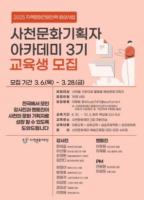 [경남도민뉴스=변정형 기자] 사천문화재단은 3월 28일까지 지역문화 전문인력 양성사업‘의 사천문화기획자 아카데미’ 3기 교육생을 모집한다고 10일 밝혔다.