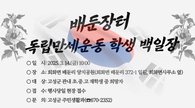 행사 일정은 3월 14일 오전 10~12시 회화면 소재 양지공원에서 실시하며, 참여대상은 고성군 내 초·중·고 학생으로 사전 또는 현장 접수로 참여가 가능하다.