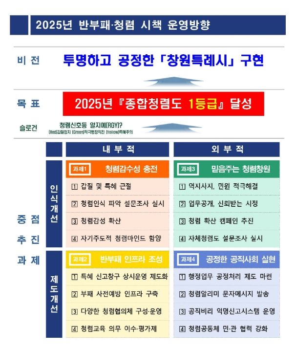 한편, 창원특례시는 2024년 국민권익위원회 주관 종합청렴도 평가에서 2등급을 달성한 바 있으며, 2025년에는 1등급 달성을 목표로 청렴시책 추진에 박차를 가할 방침이다.