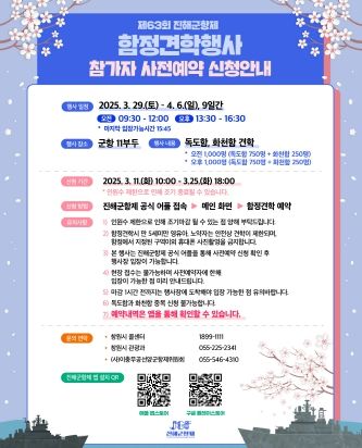[경남도민뉴스=박민호 기자] 창원특례시는 11일부터 진해군항제 해군 함정 견학행사의 사전 예약 신청을 접수한다고 밝혔다.