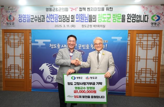 특히, 이날 청도의 발전을 기원하는 마음으로 정영철 영동군수가 100만 원, 영동군의회 신현광 의장 외 의원 일동이 80만 원을 각각 기부해 총 180만 원의 고향사랑기부금을 전달했다.