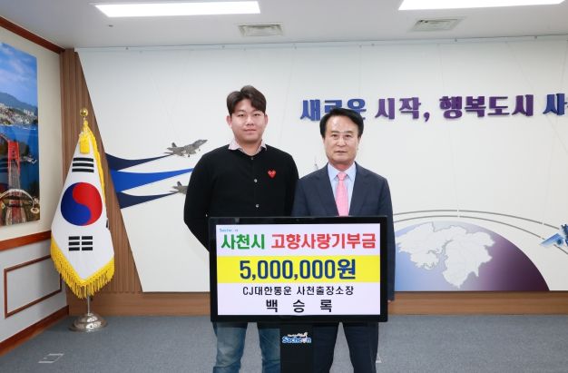 [경남도민뉴스=변정형 기자] 사천시는 백승록 대한통운 사천출장소장이 사천시청을 방문해 고향사랑기부금 500만원을 기탁했다고 12일 밝혔다.