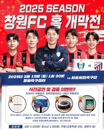 홈 개막전에 앞서 1시 30분부터는 창원연합태권도 시범단과 치어리더의 특별공연을 시작으로 선수단 격려, 시축 등 다채로운 프로그램이 진행된다. 경기장을 찾은 팬과 시민 1000명에게 선착순으로 응원도구를 증정하고, 경기 시작 전 관중석을 향해 사인볼 50개를 내빈과 선수들이 직접 차준다. 또, 하프타임과 경기 종료 후 추첨 이벤트를 통해 4도어 냉장고, 65인치(QLED) TV, 로봇청소기, 아이패드 등 경품(제세공과금 본인부담) 80여 개가 제공된다. 또, 이날 창원축구센터 장외에서는 ‘에어바운스 축구’와 ‘미니게임’ 등 다양한 체험 이벤트로 경기장을 찾은 시민들에게 즐거움을 선사할 예정이다.