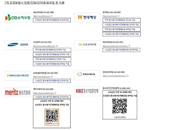 풍수해‧지진보험 가입을 희망하는 시민은 7개 민간보험사에 개별 문의해 가입 할 수 있으며 재해취약지구(재난지원금 수급, 침수사고 발생 등) 내 주택 거주자 및 소상공인들은 별도 단체가입*이 가능하다.
