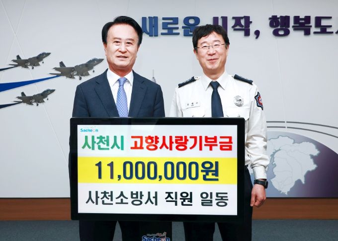 이날 사천소방서는 더 안전하고 살기 좋은 사천을 만들기 위해 110명의 직원이 자발적으로 모은 고향사랑기부금 1100만 원을 사천시에 전달했다.