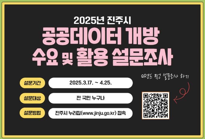 [경남도민뉴스=권중환 기자] 진주시는 시민 목소리를 반영한 맞춤형 공공데이터 개방을 통해 공공데이터의 활용도를 높이기 위한 ‘공공데이터 개방 수요 및 활용 설문조사’를 오는 4월 25일까지 실시한다고 밝혔다.