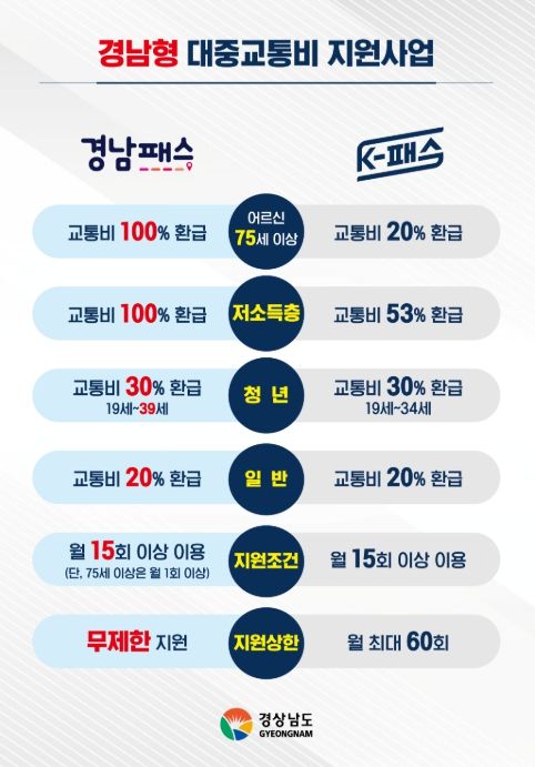 경남패스는 시내버스, 지하철 등의 대중교통을 한 달에 15회 이상(75세 어르신은 1회이상) 이용하면 이용요금의 20~100%를 환급 받을 수 있다. 특히, 전국 최초로 75세 이상 어르신과 저소득층에게 100% 환급함으로써 대중교통 복지를 실현한 사업이다.