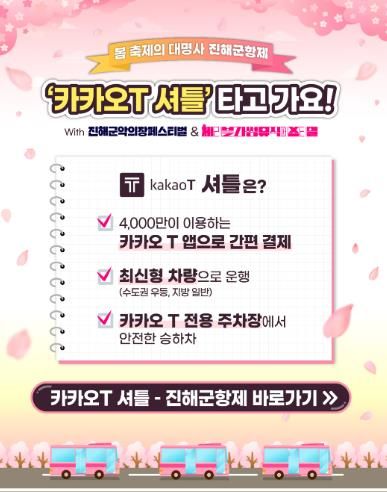 진해군항제 기간 서울, 성남, 수원 등 수도권에서 진해로 바로 이동 가능한 ‘카카오 T 셔틀’이 일정에 따라 심야까지 운행하게 되어, 군항제를 찾는 장거리 관광객들의 접근성과 편리성이 높아지게 됐다.