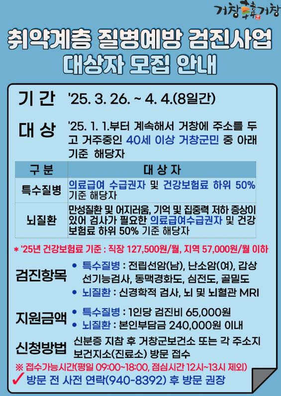 [경남도민뉴스=백형찬 기자] 거창군은 경제적 어려움을 겪는 의료취약계층의 의료안전망 강화를 위한 취약계층 질병예방 검진사업(특수질병 및 뇌질환) 대상자를 3월 26일부터 4월 4일까지 8일간 모집한다.