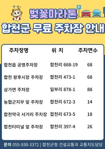 주차장 무료 개방과 관련한 자세한 사항은 합천군 건설교통과 교통지도담당으로 문의하면 된다.