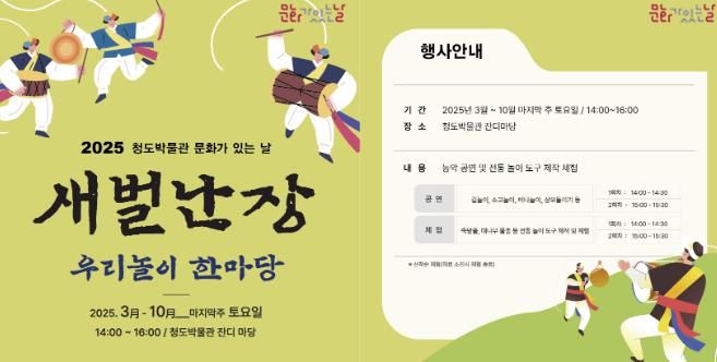 청도박물관 ‘문화가 있는 날’ 행사『새벌난장』은 매월 마지막 주 토요일 오후 2시부터 4시까지 진행되며, 별도 예약 없이 누구나 무료로 참여할 수 있다.