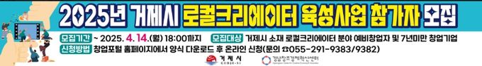 [경남도민뉴스=김부경 기자] 거제시는 ‘로컬크리에이터 육성사업’에 참여할 지역 내 예비창업자 및 창업 후 7년 미만인 창업자를 모집한다.