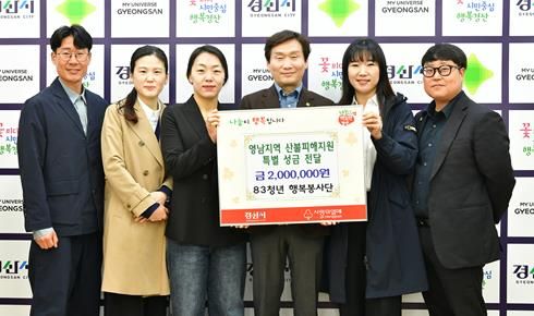 조현일 경산시장은 “산불 피해 지역에 따뜻한 마음을 전해주신 83청년 행복봉사단에 깊이 감사드리며, 기탁해 주신 성금은 사회복지공동모금회를 통해 이재민과 피해 복구를 위해 신속히 전달하겠다”고 밝혔다.