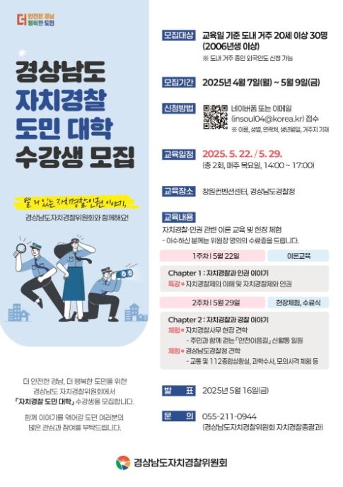[경남도민뉴스=구인애 기자] 경상남도자치경찰위원회는 자치경찰제와 인권에 대한 도민의 이해를 높이기 위해 올해 처음으로 ‘경상남도 자치경찰 도민 대학’을 운영한다.