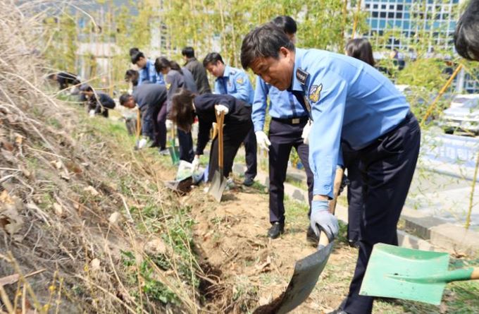 이날 행사는 경찰관 전 직원이 참여해 청사 주변과 폐화분에 개나리, 반려 식물 등 200주를 심고 가정과 경찰서에서 버려지는 화분을 수거, 폐화분 새 생명 불어넣기 등 화분에 대한 리사이클링을 활동을 벌였다.