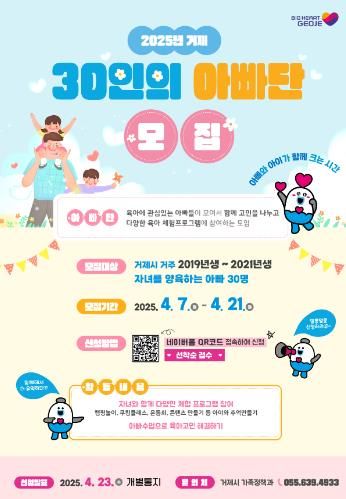 [경남도민뉴스=김부경 기자] 거제시는 아빠가 함께하는 육아 문화 확산을 위해 오는 4월 7일부터 4월 21일까지 ‘거제 30인의 아빠단’을 모집한다고 밝혔다.
