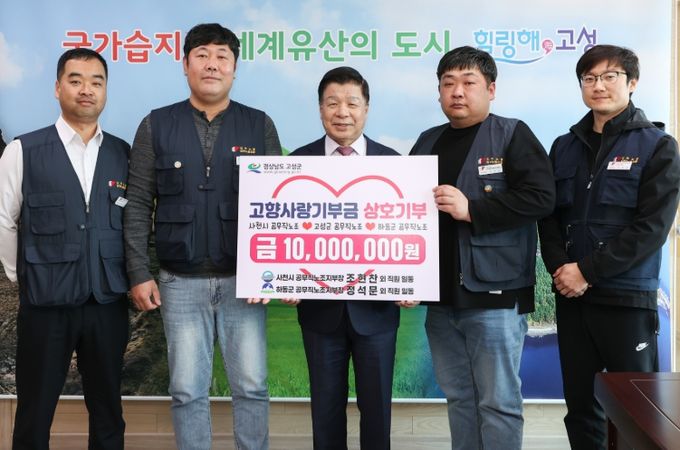 [경남도민뉴스=김태수 기자] 고성군은 4월 3일 고성군청 3층 집무실에서 고성군·사천시·하동군 공무직 노동조합원들의 자발적인 고향사랑기부금 상호기부로 고향사랑기부제 활성화 및 기부문화 확산을 실천했다고 밝혔다.