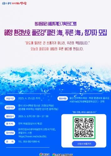 [경남도민뉴스=최미정 기자] 양산시 소주청소년문화의집은 청소년들이 해양환경에 대한 올바른 인식을 갖고, 환경 보호의 중요성을 직접 체험할 수 있도록 기획한 해양환경보호 플로깅 프로그램 '클린 海, 푸른 海'의 참가자를 모집한다.