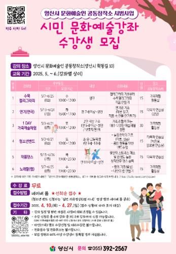 강좌별 강의계획서 등 자세한 정보는 [양산시 문화예술인 공동창작소] 네이버 카페에서 확인할 수 있다.
