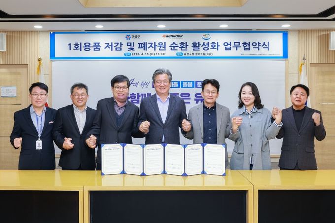 [경남도민뉴스=도문호 기자] 대전 유성구는 15일 한국타이어앤테크놀로지㈜의 중앙연구소 한국테크노돔, 대전녹색환경지원센터와 1회용품 저감 및 폐자원 순환 활성화를 위한 업무협약을 체결했다.