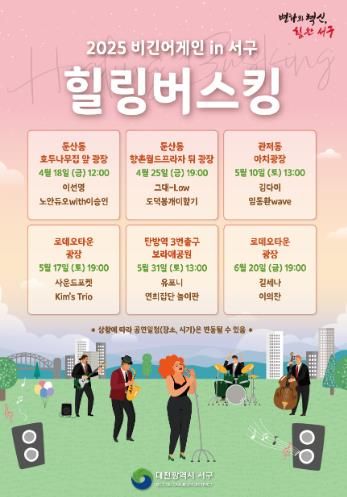 [경남도민뉴스=도문호 기자] 대전 서구는 지역 청년 음악인을 발굴·지원하는 2025년 상반기 ‘비긴어게인 in 서구 힐링 버스킹’ 공연을 이달 18일부터 6월 20일까지 총 7회 개최한다고 밝혔다.