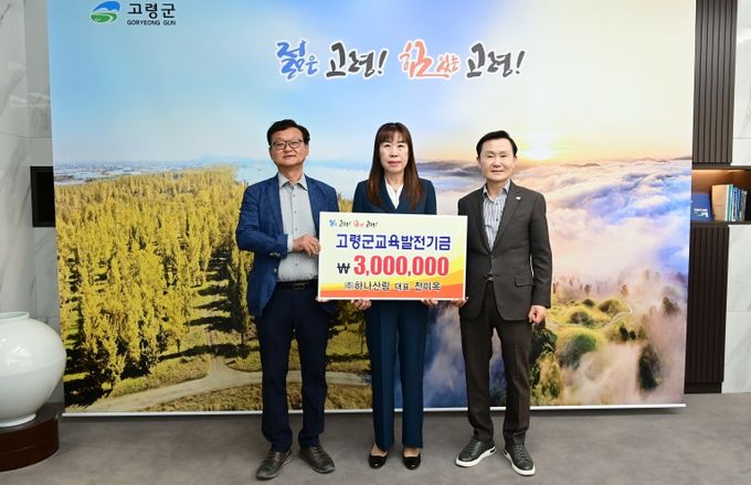 [경남도민뉴스=최민숙 기자] ㈜하나산림에서 4월 15일 고령군청을 방문하여 지역의 교육 발전과 인재 양성을 위해 사용해 달라며 교육발전기금 300만원을 기탁했다.