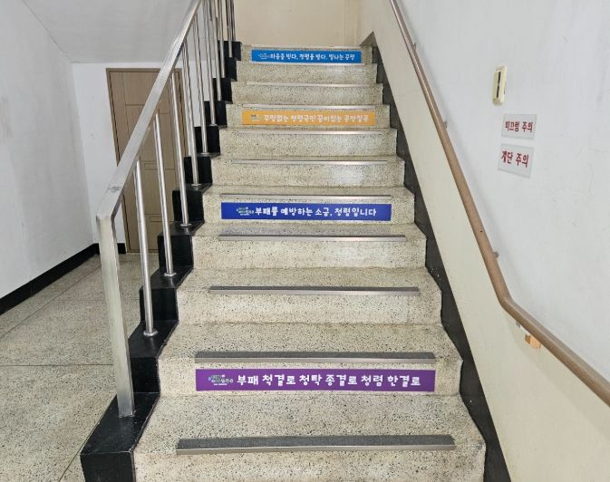 [경남도민뉴스=최민숙 기자] 칠곡군은 청렴문화 확산 및 청렴의지 표출을 위해 일상 속 청렴의식을 고취할 수 있는 근무환경 조성을 위하여 읍면사무소 청사 계단에 청렴 문구 표찰을 설치했다.