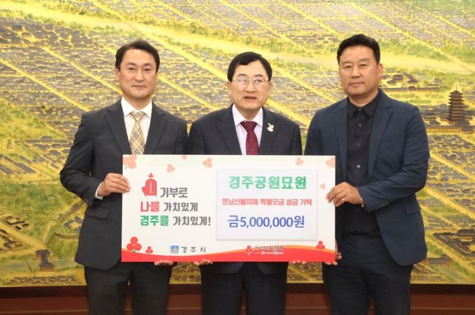 주낙영 경주시장은 “경주시의 대표적인 공원묘원에서 마음을 함께 나눠주시니 더욱 감사하게 생각한다. 보내주신 성금은 영남지역 산불 피해 이재민들에게 잘 전달될 수 있도록 하겠다”고 전했다.