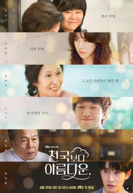 JTBC 새 토일드라마 ‘천국보다 아름다운’은 오는 19일(토) 밤 10시 40분에 첫 방송되며, 매주 토요일 밤 10시 40분과 일요일 밤 10시 30분에 방송된다.