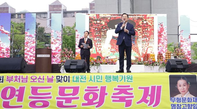 [경남도민뉴스=도문호 기자] 이장우 대전시장은 4월 19일, 불기 2569년 부처님 오신 날을 맞아 중구 서대전광장에서 열린 제17회 대전시민연등문화축제에 참석했다. 이날 행사에는 사찰신도, 시민 등 1,000여 명이 함께했으며, 오후 1시 식전문화 축하공연을 시작으로 개회 선언, 삼귀 의례 반야심경, 육법공양, 봉행사, 봉축사 순으로 진행됐다.